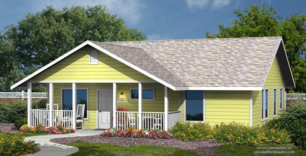 The Newport offers a spacious 1,196 square foot living space. The front of the home boasts a generous porch for sitting and enjoying the outdoors, which can be easily screened-in. An open style living room and kitchen have vaulted ceilings. The kitchen is full-sized and adjoins a large laundry room with deep sink. The master bedroom is illuminated by two windows and includes a walk-in closet. Within the spacious bathroom is a walk-in shower. The Newport is designed to meet the needs for aging-in-place with a step-less entry, 36" wide doors and hallways. With three exterior styles (lap siding, stucco and panel siding) the Newport can be finished to complement the lot's existing residence.